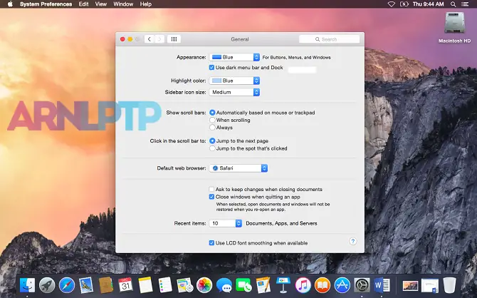Ini berfungsi jika kamu menggunakan OSX Yosemite sampai OSX Terbaru, jika kamu bosan dengan Menu Bar dan Dock berwarna putih, kamu bisa menggunakan yang berwarna hitam dengan cara System Preferences > General > Centang “Use Dark Menu Bar and Dock”. Jika sudah maka Menu Bar dan Dock kamu akan berwarna gelap (hitam).