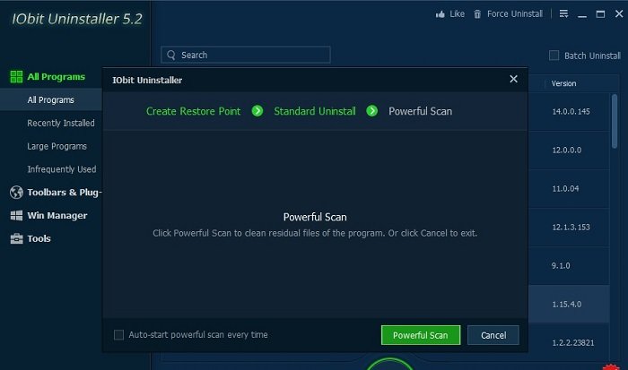 Tombol Powerfull Scan berguna untuk mengidentifikasi seluruh file yang akan diuninstall di komputer kita. Dengan kata lain memindai program secara keseluruhan.